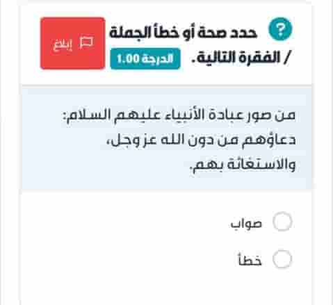 خطأ. العبارة، من صور عبادة الأنبياء عليهم السلام: دعاؤهم من دون الله عز وجل، والاستغاثة بهم. خاطئة.